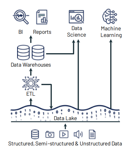 These can be ingested into modern data warehouses for analytics, often after some preprocessing. For instance, text can be analyzed with NLP before storing, or images can be processed into feature vectors.